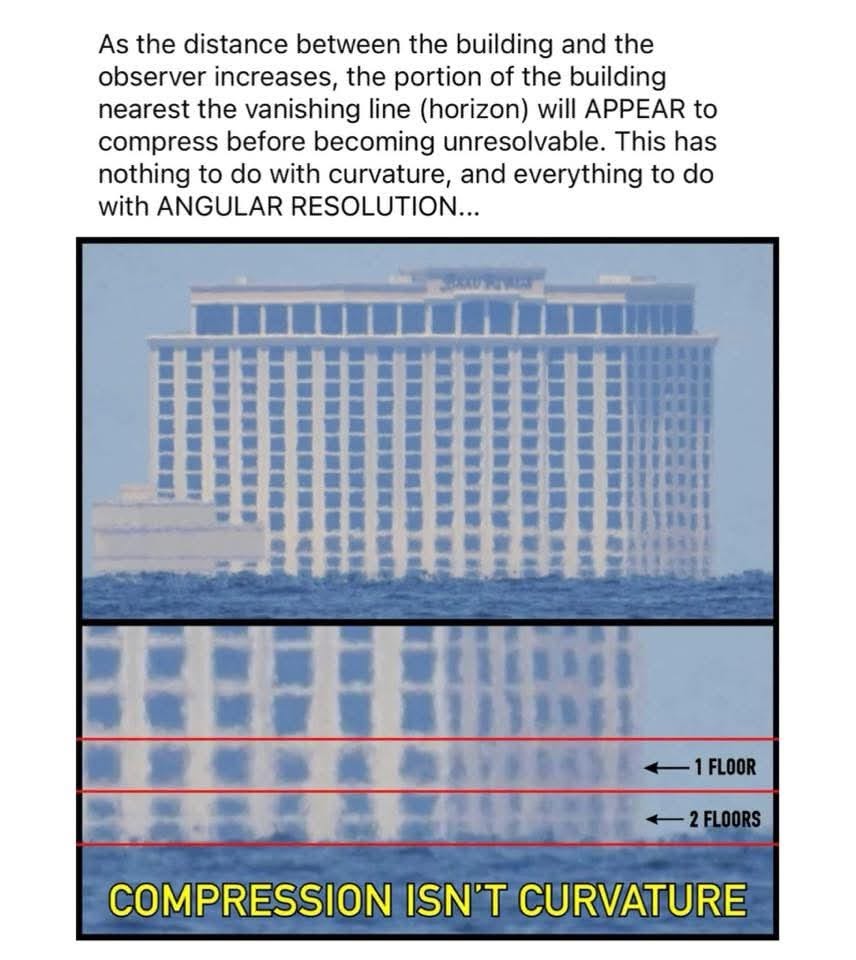 This image explains the concept of angular resolution and how it affects the appearance of distant objects. It argues that the apparent compression of a building near the horizon is due to angular resolution, not the curvature of the Earth.