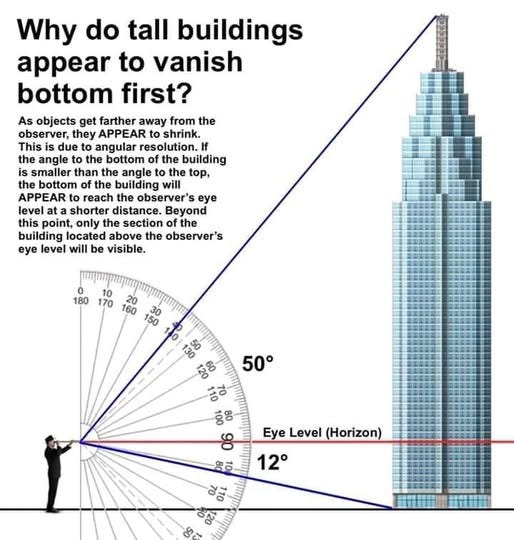 Vantage Point and Visibility: Climbing to a higher vantage point on a Flat Earth allows you to see farther and brings objects that were previously hidden beyond the geometric horizon back into view, from the top down. In order to resolve the truncated and compressed horizon line more readily at the building’s base, you can simply elevate yourself up to a higher altitude, and then, the building’s lower compression line will extend itself out further, thereby resulting in the angular resolution of the lower section of the building falling back to normal dimensions. When you elevate yourself, you move the distant vanishing line/band of convergence line higher, which illustrates how vanishing point perspective optics are effecting your perception of the building’s lower portion and not Earth curvature.