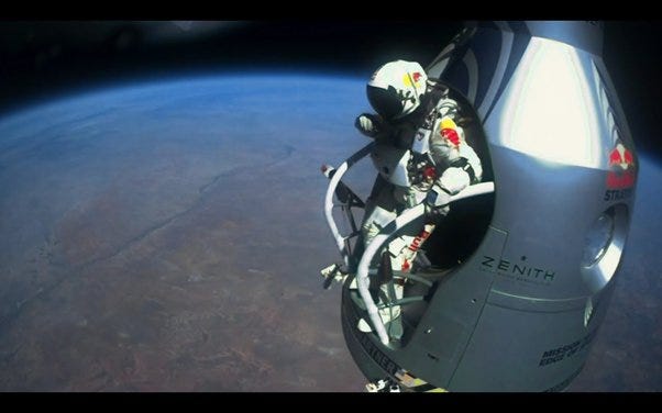 Government funded, Austrian military pawn, Felix Baumgartner, is an Austrian skydiver, daredevil, and BASE jumper. He is best known for jumping to Earth from a helium balloon from the stratosphere on 14 October 2012 and landing in New Mexico, United States as part of the Red Bull Stratos project. Doing so, he set world records for skydiving an estimated 39 km (24 miles), reaching an estimated top speed of 1,357.64 km/h (843.6 mph), or Mach 1.25.