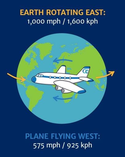 You should cover more ground and faster when you fly AGAINST Earth's alleged spin than when you fly WITH it because the ground is moving towards you at 1000 mph. You are not locked in the Earth's atmosphere. You are flying independent of it and relative to the ground when you take flight. Otherwise you would never be able to get anywhere in the Earth's atmosphere had you been locked into it as the Earth spun. You need to act independent of the Earth's alleged spin to travel relative to this spin. But, then you would take drastically different times to travel the same distance because of that 1000 mph spin acting beneath you. However this is not the case. This is not what we observe from a non-inertial frame of reference. And because we don’t observe this, it supports the claim that the axio-rotation of the Earth is not a variable in our equation.
