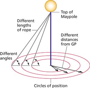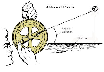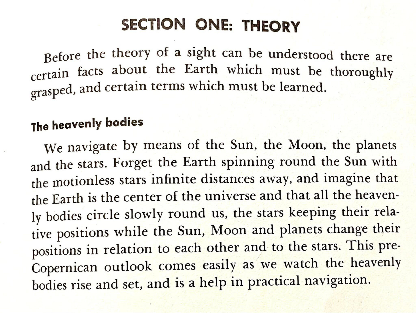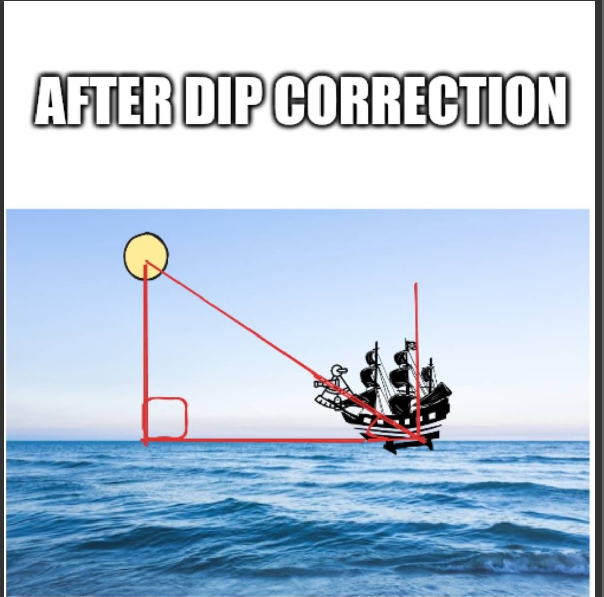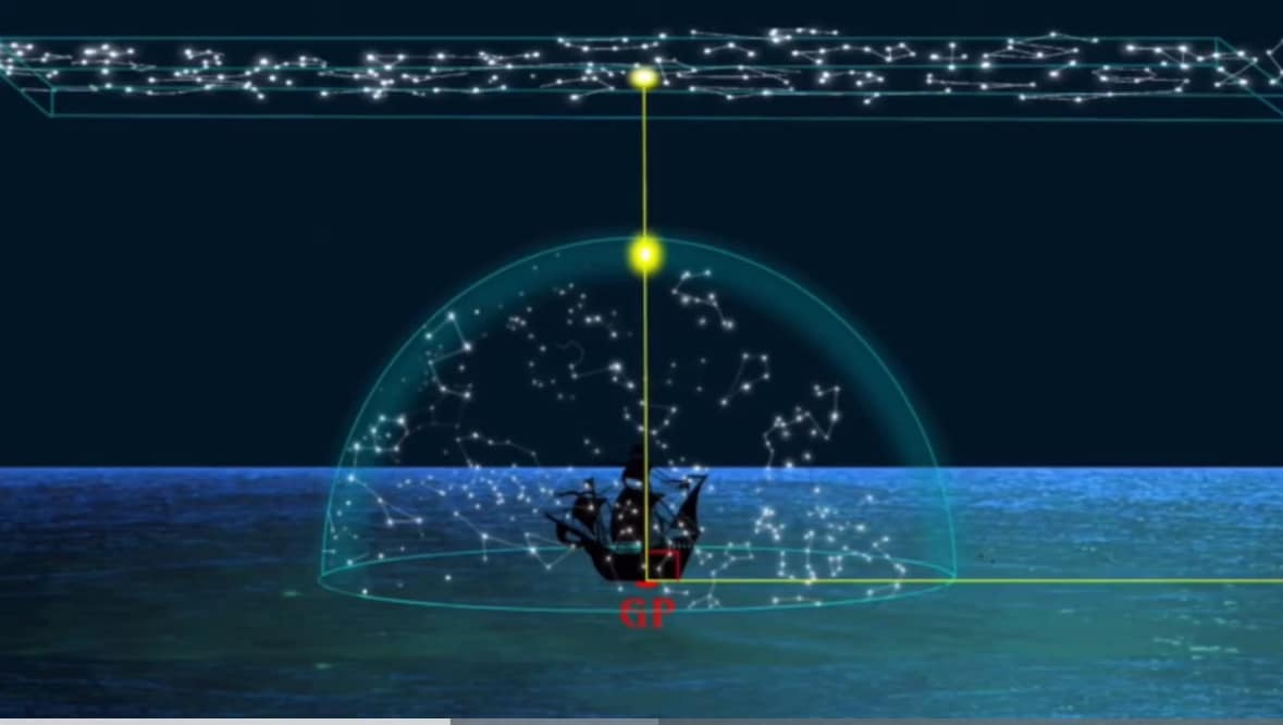 Then, to measure The Sun’s apparent elevation, for example, a user aligns The Sun’s reflected image with the horizon viewed directly, and the angle measured on the sextant scale will be double the angle of elevation (the angle between the horizontal and a line of sight to the celestial object above the horizontal). Once you’ve removed your height of eye using Dip Correction, the angle to your celestial point becomes translated as if having been placed upon the ocean’s surface beneath the ship, which requires a flat horizontal baseline, of course, something that The Globe Model lacks.