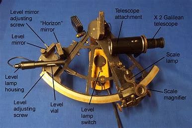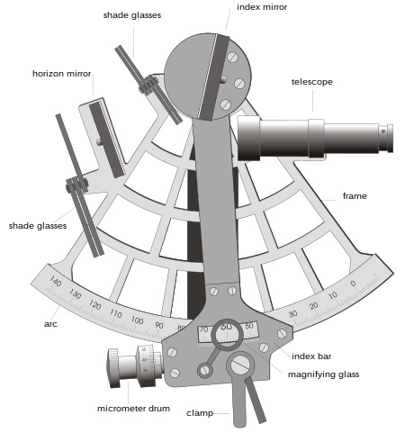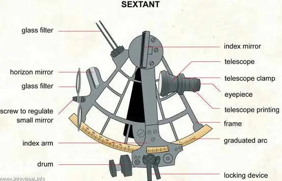 A diagram of a typical nautical sextant, a tool used in celestial navigation to measure the angle between two objects viewed by means of its optical sight: