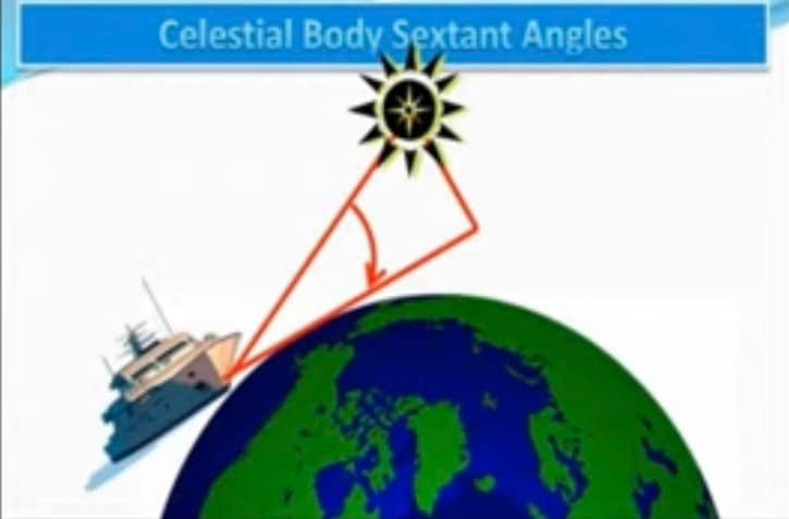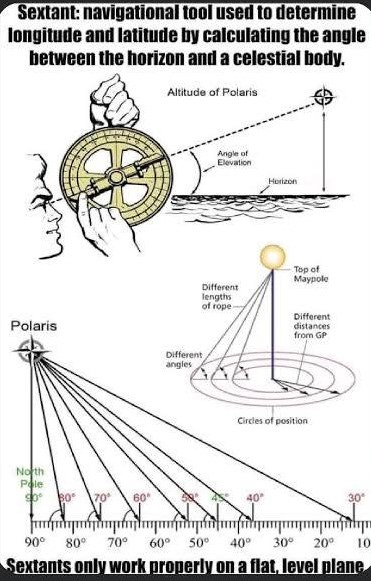 A marine sextant uses a flat baseline for its angles. A spherical Earth does not have a flat baseline, and thus, cannot be used for Celestial Navigation, but must be applied secondarily via spherical trigonometric calculation translations, ensuing the use of a Flat Earth. The whole methodology requires a Flat Earth. With a marine sextant, and before Dip Correction, you measure an angle between the observer’s line of sight to a chosen celestial body, generally The Sun by day and Polaris by night, for example, and you also measure an angle from the observer’s line of sight, holding the sextant at eye height, to the line at the visible horizon, also called the apparent or sensible horizon. This is accomplished from the observer’s eye position on a ship.