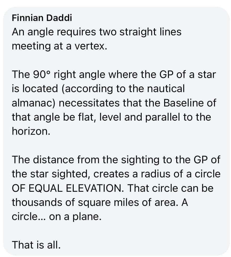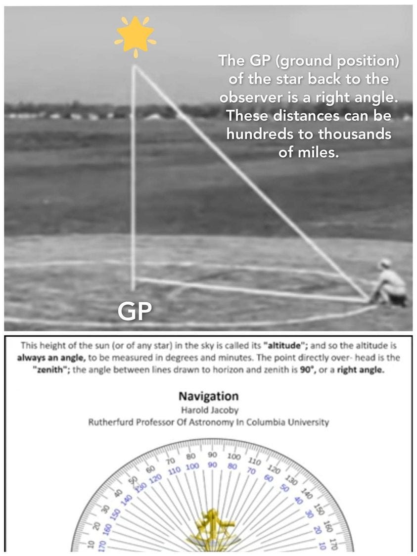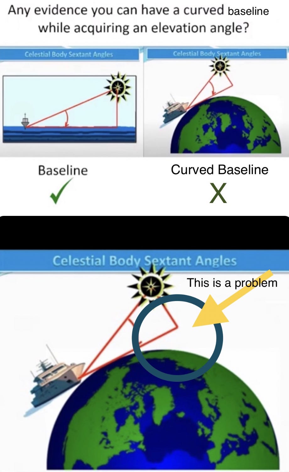 Even the slightest elevation angle error destroys the calculations. After 10 miles of baseline, you’ve already corrupted your entire right triangle integrity...hence the reason a spherical Earth can’t work for Sextant calculations. A flat plane is always assumed by navigators, and only later are spherical geometry calculations superimposed upon this flat plane in order to arrive at a reified (abstract representation) imaginary globe model.