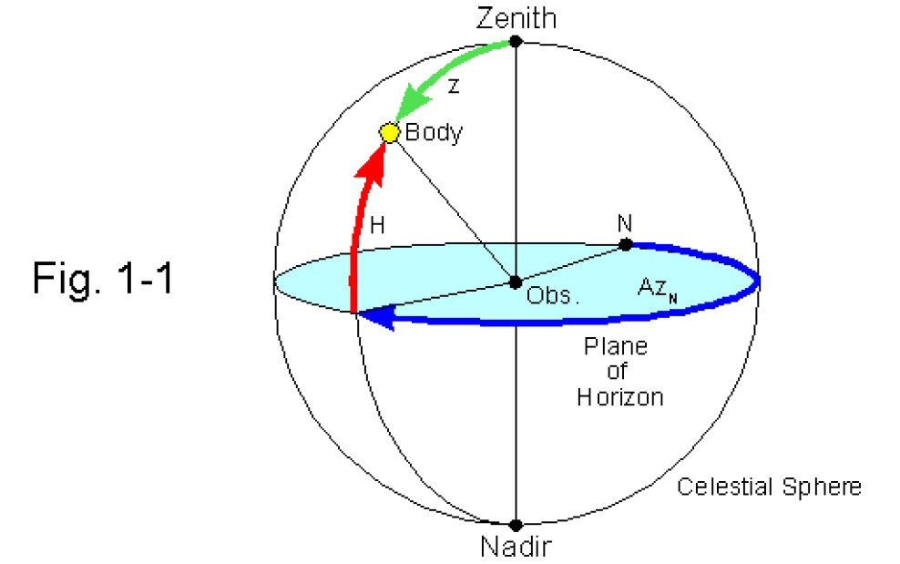 Then, in order to find your desired angle of elevation for your calculations, you need to correct for height of eye above sea level. An “angle of elevation” is the angle between the horizontal and a line of sight to the celestial object above the horizontal, and a sextant is used to measure this angle by using mirrors to align the sight of an object with the horizon. With a sextant, the term for “the horizontal” is the sensible horizon (the plane perpendicular to a navigator’s “zenith”), which is a point directly overhead the navigator, 90 degrees from the horizon. It is crucial for celestial navigation because the zenith distance (the angle between a celestial body and the zenith) can be calculated and used to determine a ship’s position. Sextant measurements are often taken of the celestial body’s altitude (angle above the horizon), and this is then used to find the zenith distance by subtracting the altitude from 90 degrees.