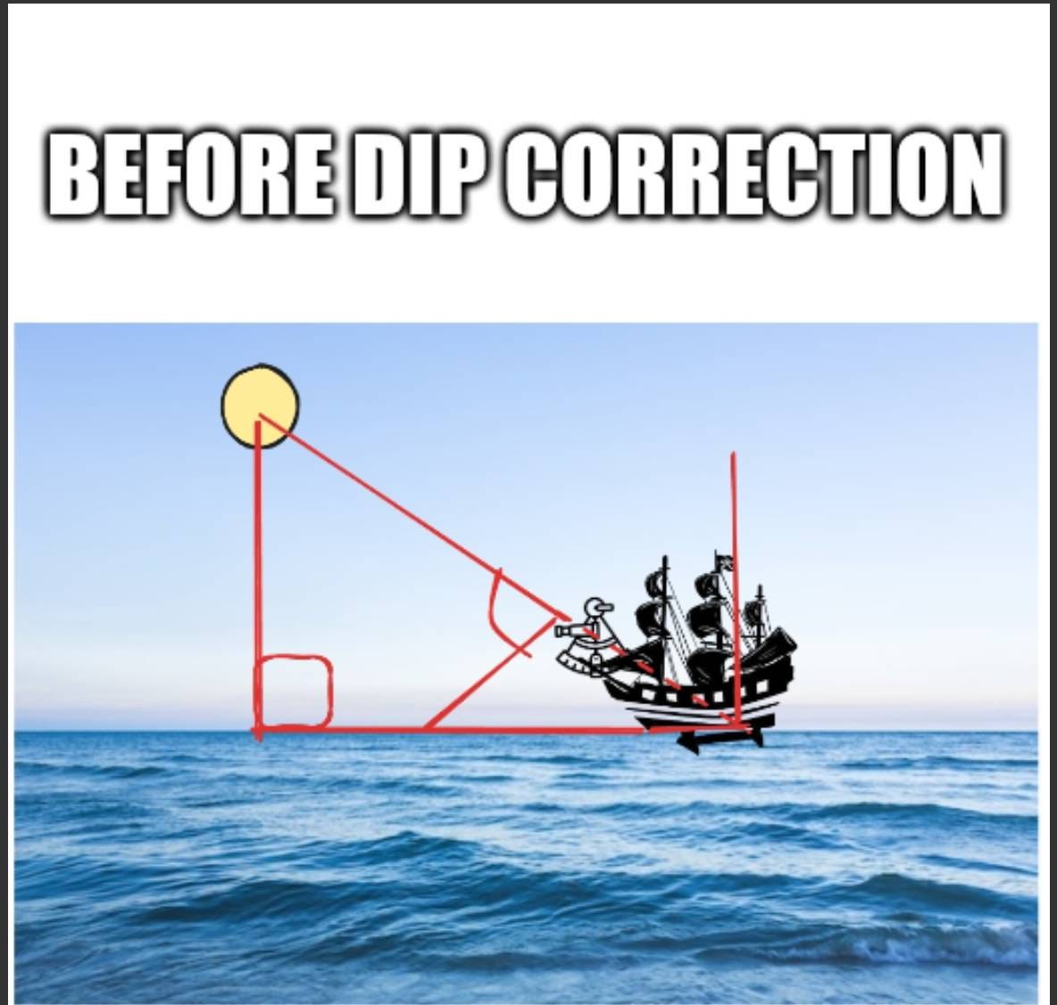 However, a sextant cannot use the sensible horizon directly for celestial navigation. It relies on the visible horizon on the ocean surface, which requires a correction known as Dip Correction. Dip Correction in sextants is the adjustment needed to account for the fact that an observer’s eye is above sea level, which causes the visible horizon to appear lower than the true horizon. This makes the measured angle (sextant altitude) too large, so the Dip Correction, a negative value, must be subtracted from the reading to find the apparent altitude. This correction is determined by the observer’s height of eye above the water and is typically found using tables in a Nautical Almanac or calculated with a formula.