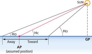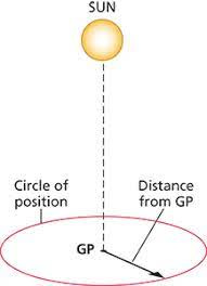 Plot a Line of Position (LOP): A single sextant measurement establishes that the navigator is somewhere on a large circle on the Earth’s surface that is centered on the GP.