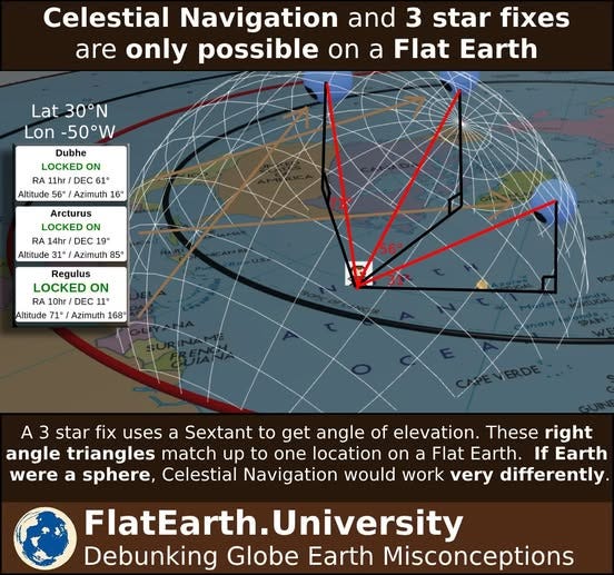 “Our recent submission to the MCToon Sextant Challenge has successfully demonstrated a three-star fix algorithm based on Flat Earth geometry, with the final location of latitude 30 and longitude -50 confirming its precision. By using celestial data from an almanac and a brute-force computational approach, the algorithm accurately calculates the observer’s position based solely on the angle of elevation of stars, without requiring spherical trigonometry. This process offers a compelling proof of concept for celestial navigation on a Flat Earth.