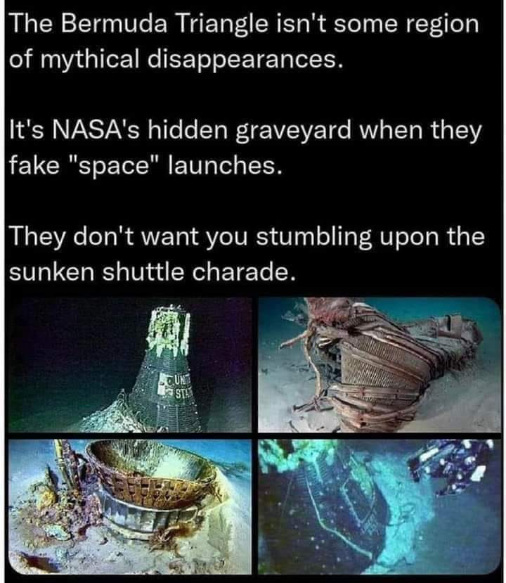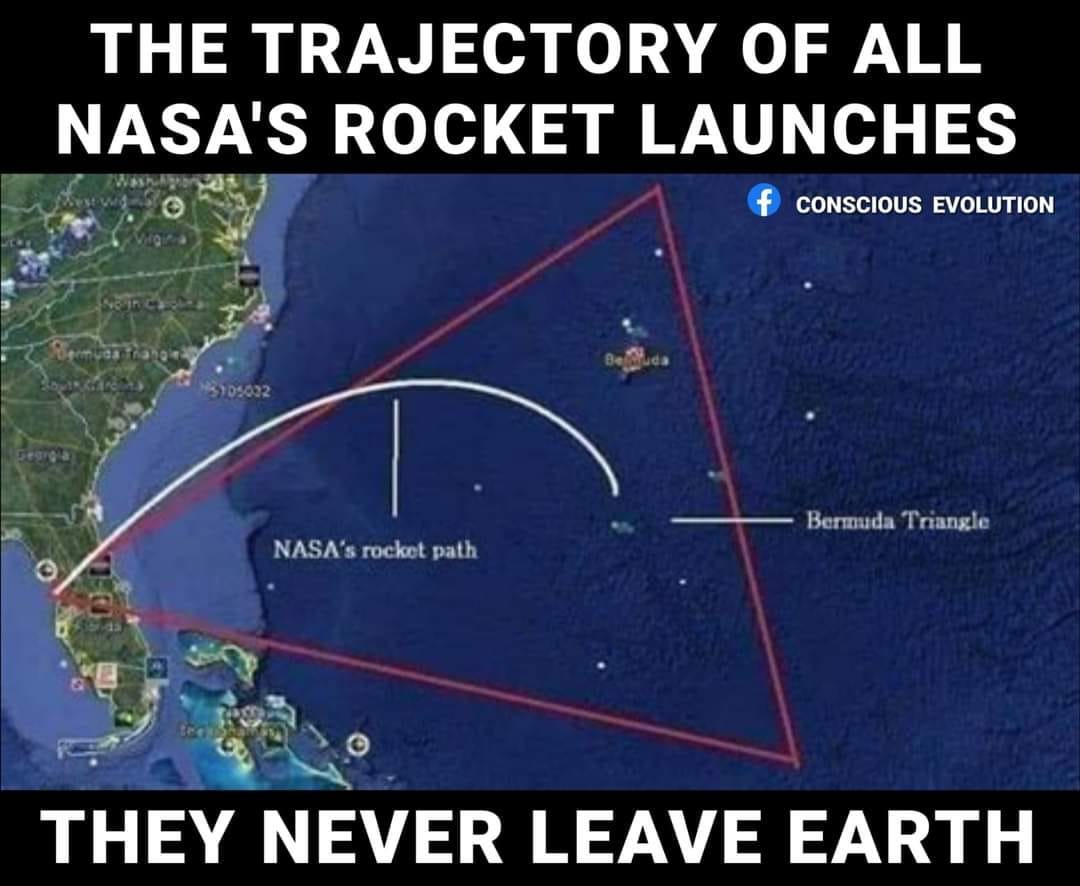 Ok, so now that we have established the nonsensical absurdity behind escape velocity, and rest assured, NASA knows it too, why would they push this narrative every time they execute a rocket launch? The answer is two words: Bermuda Triangle. NASA has never left Earth’s lower orbit, as even they have confessed to, accidentally. They have nowhere else to go but laterally, and so they put on a big show and send the rockets horizontally, as every NASA rocket launch has clearly shown, and they tell everyone that they have to shoot horizontally to achieve escape velocity. It’s their little cover up story.